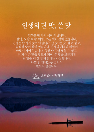 * 인생은 한 가지 색이 아닙니다. 빨강, 노랑, 파랑, 하양, 모든 색이 섞여 있습니다. 인생은 한 가지 맛이 아닙니다. 단 맛, 쓴 맛, 떫고, 맵고, 끔찍한 맛이 섞여 있습니다. 인생의 개념과 비밀이 바로 여기에 있습니다. 항상 단 맛만 맛볼 수 없고, 더 자주 쓴 맛을 맛보게 되며, 쓴 맛을 보았기에 단 맛을 더 잘 알게 된다는 사실입니다. 나쁜 일 뒤에는 좋은 일이 반드시 있습니다.