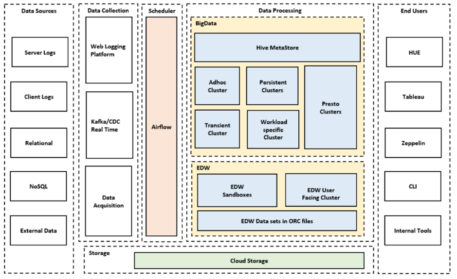 엔터프라이즈 데이터웨어하우스(EDW): 데이터 플랫폼의 주요 데이터 웨어하우스 환경은 ORC 파일이며 하이브/휴(Hive/Hue), 프레스토/제플린(Presto/Zeppelin)을 통해 접속할 수 있습니다. 여전히 EDW 고객에게 MPP 기반의 샌드박스가 제공되지만 이는 EDW의 일부분에 불과합니다. 주요 기능은 고객이 프로덕션에 앞서 샌드박스 테이블을 빌드 하고 이를 통해 도메인 비즈니스를 관리할 수 있는 환경을 제공하는 것입니다. 더불어 고객의 샌드박스 테이블이 리포팅에 필요할 경우, 이 환경에서 단기적인 리포팅을 할 수 있다. 다만 장기간 리포팅을 하거나 공유해야 할 경우, 사용자가 관리하는 테이블을 클라우드 스토리지 기반의 테이블로 이관할 것을 권장합니다.