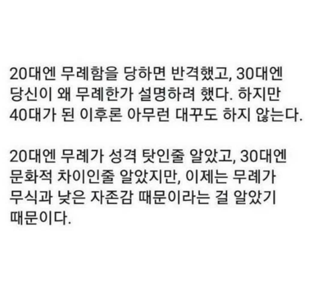 20대엔 무례함을 당하면 반격했고, 30대엔 당신이 왜 무례한가 설명하려 했다. 하지만 40대가 된 이후론 아무런 대꾸도 하지 않는다.