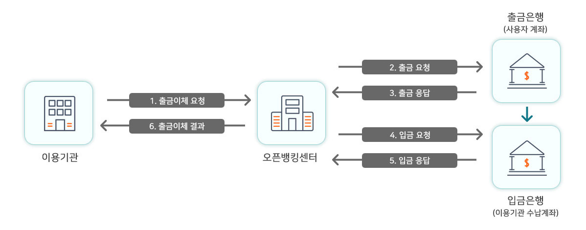 오픈뱅킹에서 이용기관은 6개의 서비스 API, 인증/관리 API를 이용할 수 있습니다.