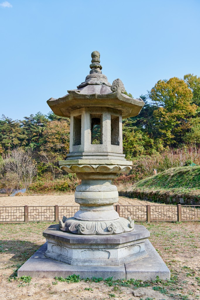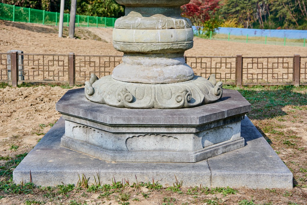 지대석은 현재 6매의 판석을 모나 마련된 상태로, 남측과 서측부에 연결된 판재 3매 만이 원 부재로 추정된다. 하대석은 팔각형 평면으로 하단석과 상단석으로 구분되었다. 고복석은 상하 연화 복석 사이에 원구형의 석재를 끼워 넣어 간주석의 높이를 높인 상태이다. 상대석은 팔각으로 조성됐는데 하면은 연판 안에 보상화문(寶相華文)이 조식된 단엽 8판의 앙련이 조각되었고, 상면에는 별석으로 조성된 굽형 괴임대를 두어 화석을 받고 있다. 화사석 역시 팔각으로 조성되었는데 각 면마다 사각형의 화창을 개설하였다. 화창(火窓)의 간지(間地)에는 모두 136자의 조성기가 음각되어 있다.