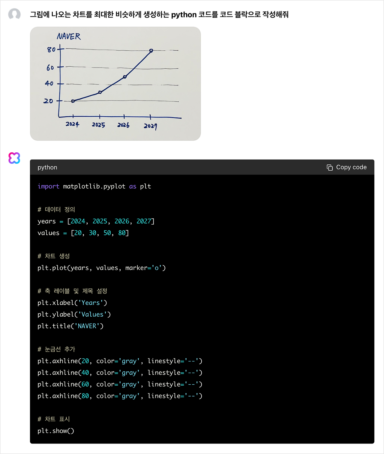 Code Generation 특정 도형이나 차트, 그래프 등을 생성하는 데 필요한 코드를 생성할 수 있습니다.