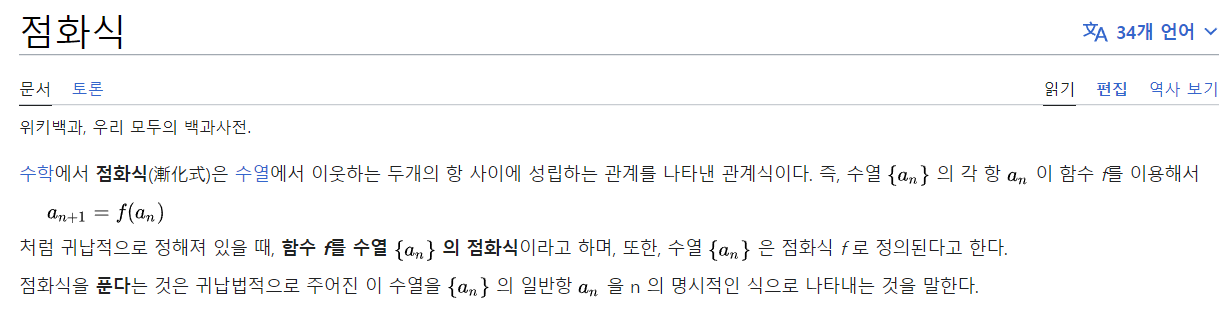 수학에서점화식(漸化式)은수열에서 이웃하는 두개의 항 사이에 성립하는 관계를 나타낸 관계식이다.
