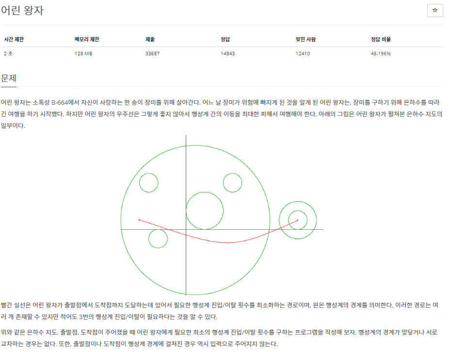 빨간 실선은 어린 왕자가 출발점에서 도착점까지 도달하는데 있어서 필요한 행성계 진입/이탈 횟수를 최소화하는 경로이며, 원은 행성계의 경계를 의미한다. 이러한 경로는 여러 개 존재할 수 있지만 적어도 3번의 행성계 진입/이탈이 필요하다는 것을 알 수 있다.