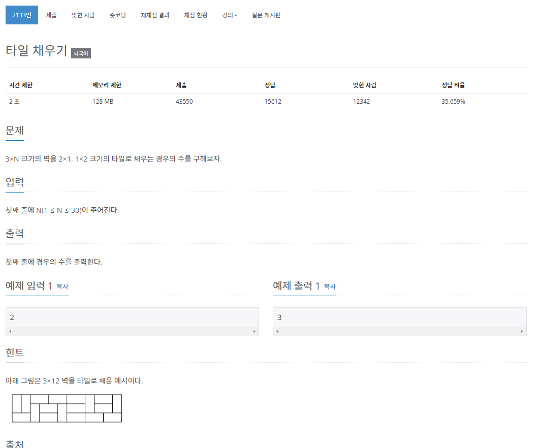 | [백준] 2133번 타일 채우기 - PYTHON (0) | 2023.02.06 |