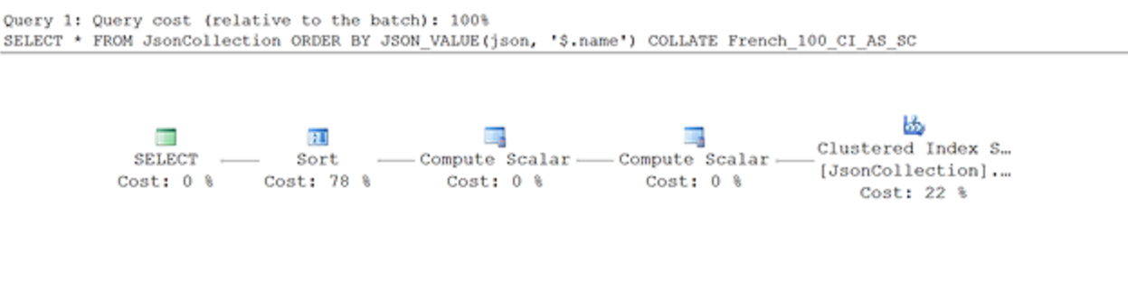 그러나ORDER BY식의 데이터 정렬을 변경하면(예:JSON_VALUE함수 뒤에COLLATE French_100_CI_AS_SC추가) 다른 쿼리 실행 계획이 제공됩니다.