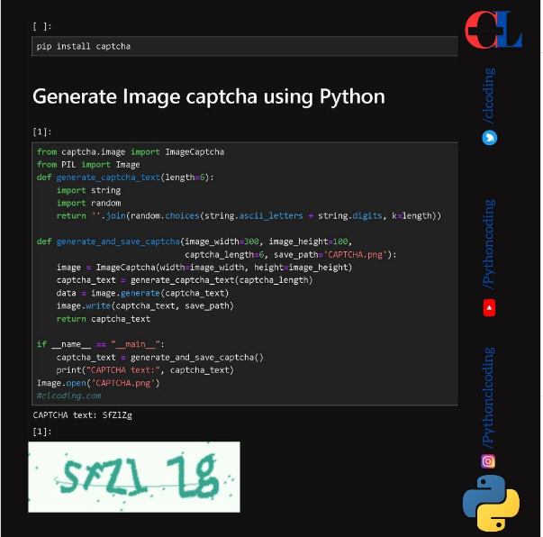 In this article, we are going to see how to generate a captcha using Python package captcha to generate our ownCAPTCHA(Completely Automated Public Turing Test to Tell Computers and Humans Apart) in picture form. CAPTCHA is a form of challenge-response authentication security mechanism. CAPTCHA prevents automated systems from reading the distorted characters in the picture.