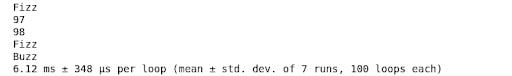 Timed results for FizzBuzz using itertools. | Image: Emmett Boudreau