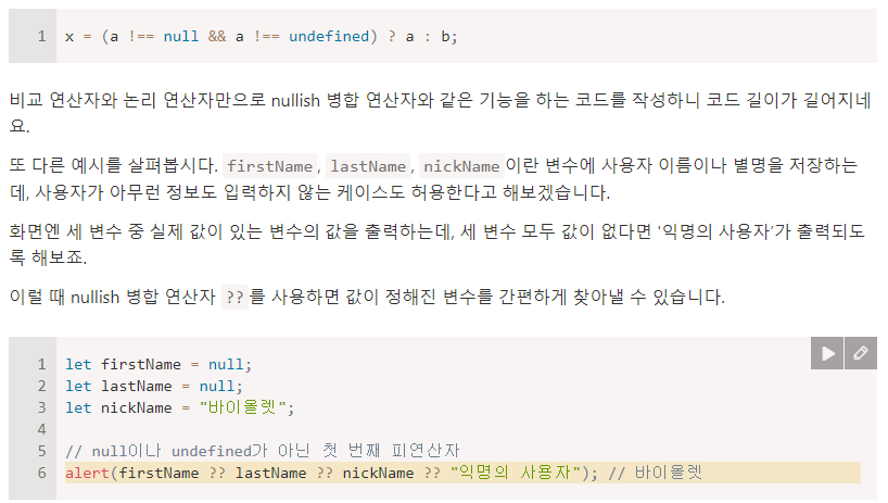 | [javascript] nullish 병합 연산자(nullish coalescing operator) (0) | 2023.10.11 |