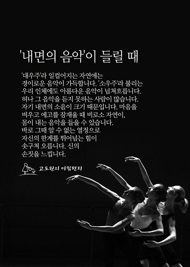 * '대우주'라 일컬어지는 자연에는 경이로운 음악이 가득합니다. '소우주'라 불리는 우리 인체에도 아름다운 음악이 넘쳐흐릅니다. 허나 그 음악을 듣지 못하는 사람이 많습니다. 자기 내면의 소음이 크기 때문입니다. 마음을 비우고 에고를 잠재울 때 비로소 자연이, 몸이 내는 음악을 들을 수 있습니다. 바로 그때 알 수 없는 열정으로 자신의 한계를 뛰어넘는 힘이 솟구쳐 오릅니다. 신의 손짓을 느낍니다.