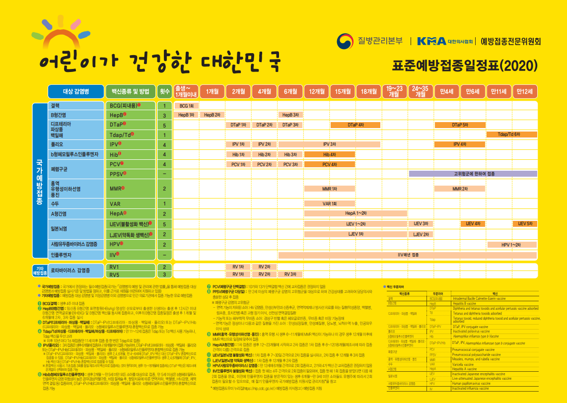 2020년 표준예방접종일정표입니다.