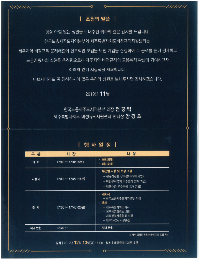 <2019 제주지역 비정규직 근로환경개선 우수기업_비정규직복지 우수분야> 시상식