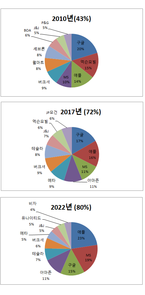 왜냐면 이때쯤 미국 주식시장 최상위에 구글, 애플, 마이크로소프트가 올라왔거든요. 2013년에는 테슬라가 상위 10위안에 올라오고, 2015년 페이스북, 2017년 아마존이 10위 안에 들어왔습니다. 2021년 엔비디아까지 상위 20위로 올라오게 됩니다. 우리가 GAFA(구글, 애플, 페이스북, 아마존) 니 FAANG(페이스북, 애플, 아마존, 넷플릭스, 구글) 이라는 단어를 만들고 미국주식 열풍이 불기시작한 것이 이 시기거든요. 테크기업 시총 비중 43%->80% 하지만 단순히 순위로 보면 빅4(애플, MS, 구글, 아마존)의 지위가 드러나지 않는데요. 미국 기업들의 시가총액 상위 10위에서 테크기업들이 차지하는 비중을 보면 알 수 있습니다. 2010년 구글, 애플, MS 가 상위 10위에 있었고 이 회사들이 10개 회사 시가총액을 합친 것 중 43%를 차지했습니다. 이것도 적지 않은 규모인데요. 2017년에는 이 비중이 72%로 올라갔구요. 2022년 초 빅테크 기업들의 가치가 천정부지로 오를때는 상위 5개 테크기업이 차지하는 비중이 80%에 달했습니다. 지금은? 73%로 낮아졌습니다. 2017년에 상위 10위권에 있었던 페이스북(메타)이 탈락한 것도 있지만 과도했던 기업가치 격차가 정상적인 수준으로 좁혀졌다고 볼 수 있을 것 같습니다. |