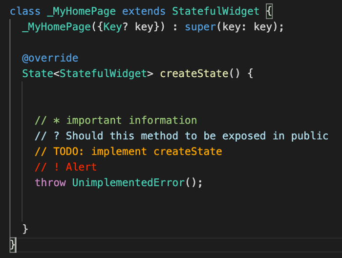 All you have to do is start a comment with *, !, ?, or TODO, and it will be colored in an assigned way. You can also create your own comment styles using the settings.json file.