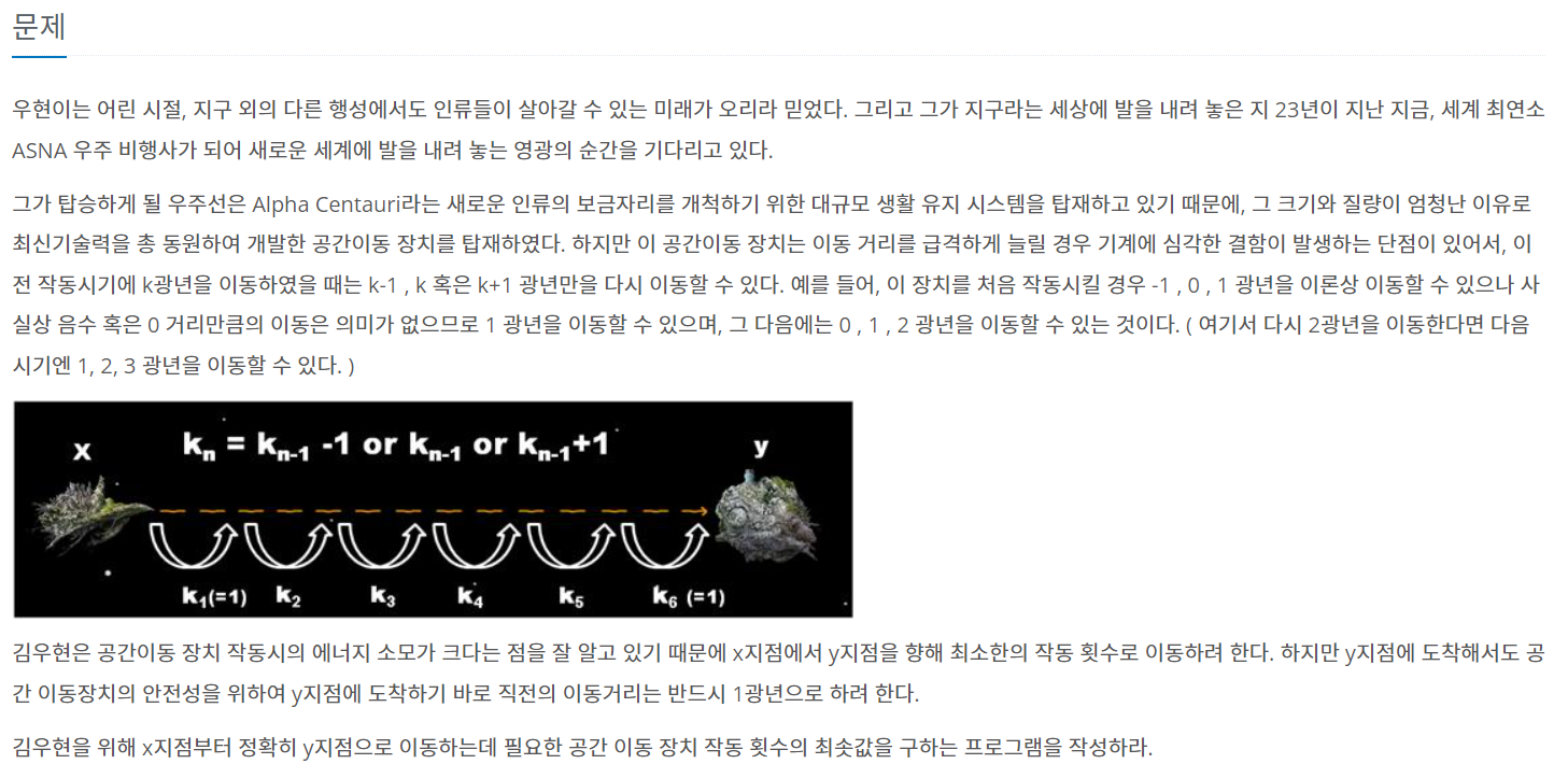 김우현을 위해 x지점부터 정확히 y지점으로 이동하는데 필요한 공간 이동 장치 작동 횟수의 최솟값을 구하는 프로그램을 작성하라.