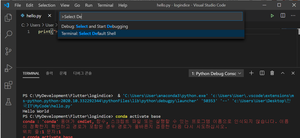 이 기본 터미널의 종류를 cmd 또는 cmdGit Bash로 변경하면 오류없이 실행이 가능합니다. 먼저 Ctrl + Shift + P (컨트롤 + 쉬프트 + P) 키를 눌러 Command Palette를 열고 Terminal: Select Default Shell 을 입력합니다.