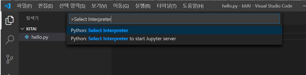 코드를 실행하기 전에 인터프리터를 선택해야 합니다. Ctrl + Shift + P (컨트롤 + 쉬프트 + P) 키를 눌러 Command Palette를 열고 Python: Select Interpreter 을 입력합니다.