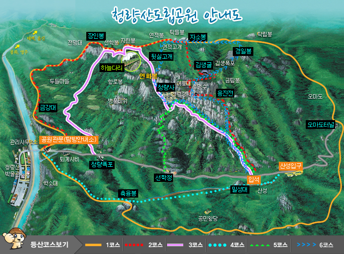 관문(출발점-0km) > 청량폭포(1.1km) > 선학정(1.9km) > 입석(2.7km) > 산성입구(3.0km) > 물티제(4.6km) > 재산출입구(5.5km)