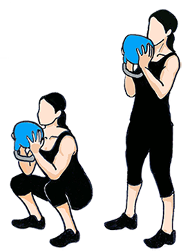 - ① 두발을 골반 너비만큼 벌리고, 케틀벨을 어깨 높이까지 들고 선다.