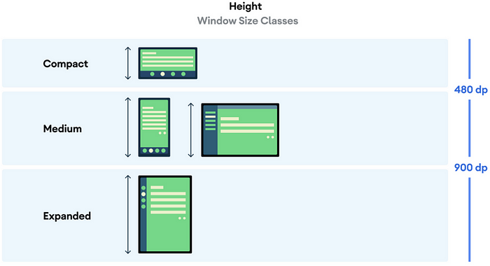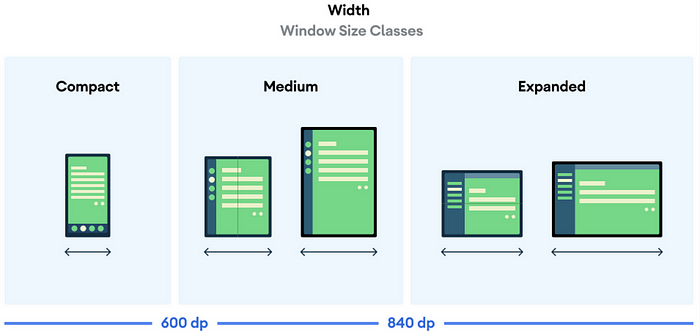 With the growth in the use of mobile devices with different form factors, we need to have tools that allow us to work with our Android applications adapted to different types of screens. That is why Android provides us with Window Size Classes, which, in a simple way, are three large groups of screen formats that mark critical points for us to develop our designs. With this we avoid the complexity of thinking about many screen designs to reduce our possibilities to 3 groups which are: Compat, Medium and Expanded.