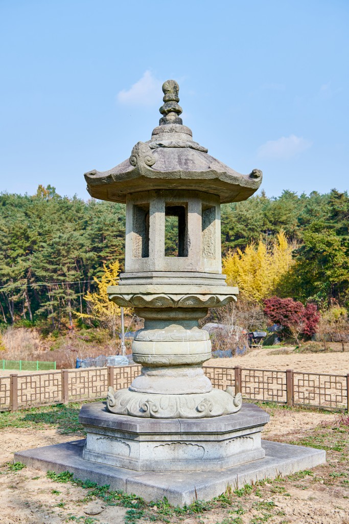 지대석은 현재 6매의 판석을 모나 마련된 상태로, 남측과 서측부에 연결된 판재 3매 만이 원 부재로 추정된다. 하대석은 팔각형 평면으로 하단석과 상단석으로 구분되었다. 고복석은 상하 연화 복석 사이에 원구형의 석재를 끼워 넣어 간주석의 높이를 높인 상태이다. 상대석은 팔각으로 조성됐는데 하면은 연판 안에 보상화문(寶相華文)이 조식된 단엽 8판의 앙련이 조각되었고, 상면에는 별석으로 조성된 굽형 괴임대를 두어 화석을 받고 있다. 화사석 역시 팔각으로 조성되었는데 각 면마다 사각형의 화창을 개설하였다. 화창(火窓)의 간지(間地)에는 모두 136자의 조성기가 음각되어 있다.