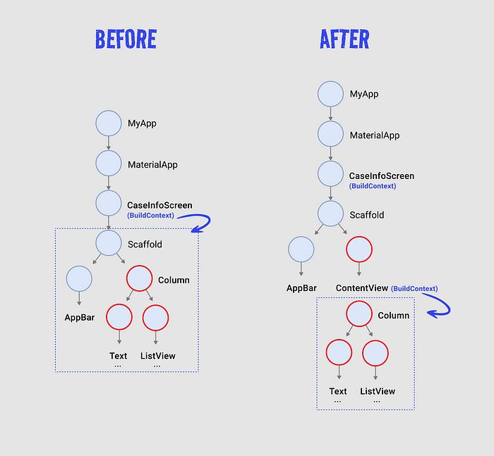 We want to obtain the rendered size of the Column widget through its associated RenderObject. However, the BuildContext that can access the RenderObject is located higher up at the CaseInfoScreen level. This means that if we proceed like this, we’ll end up measuring not only the size of the Column but also the size of the AppBar, which is a child widget of the Scaffold.