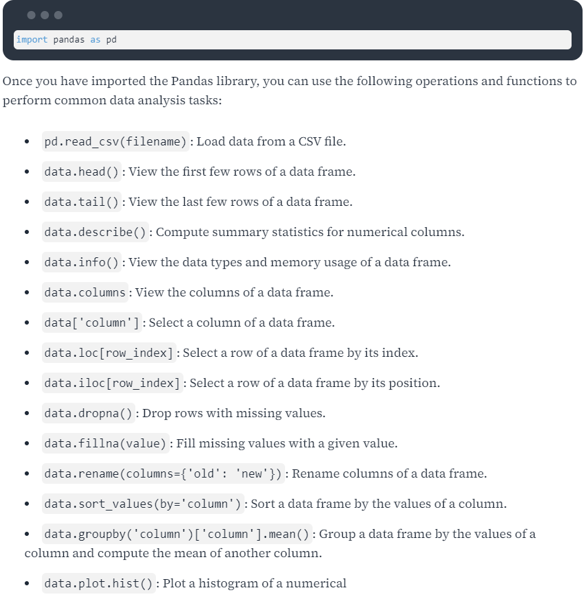 Pandas 라이브러리를 가져온 후에는 다음 작업과 함수를 사용하여 일반적인 데이터 분석 작업을 수행할 수 있습니다.