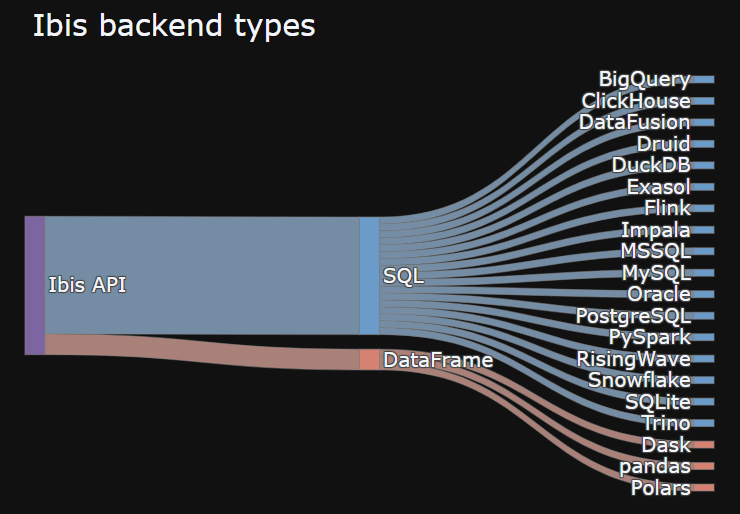 Ibis defines a Python dataframe API that executes on any query engine – the frontend for any backend data platform, with 20+ backends today. This allows Ibis to have excellent performance – as good as the backend it is connected to – with a consistent user experience.