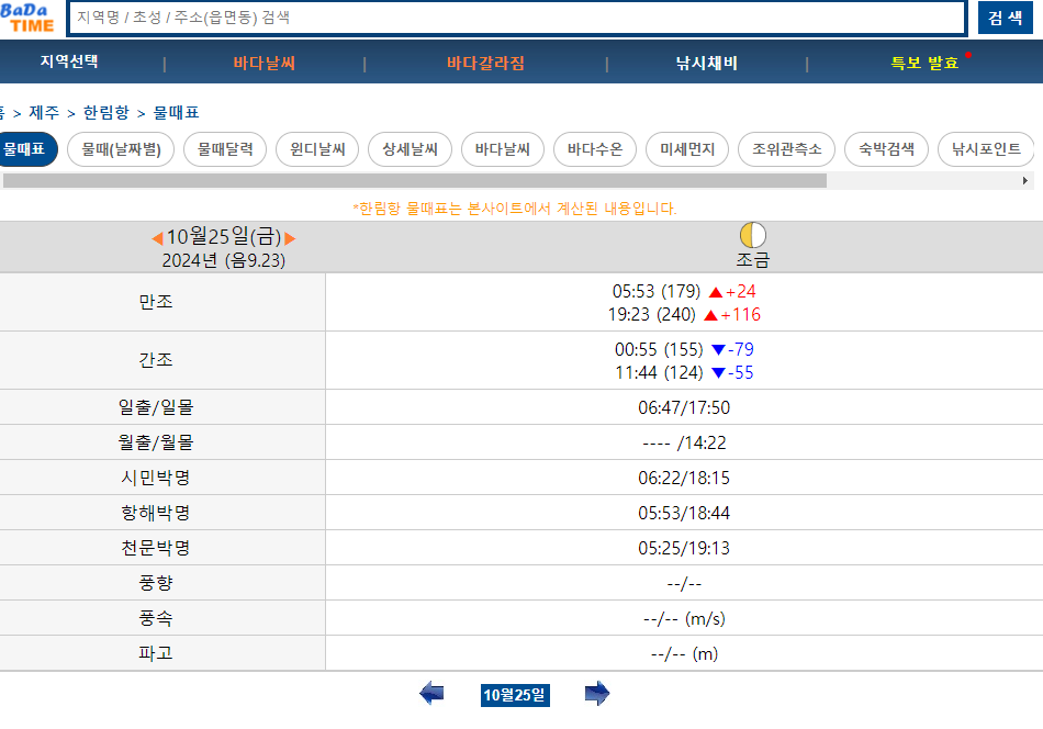 [물때] 2024-10-25, 한림항 물때표. 금능해변. 실시간 제주 해변
