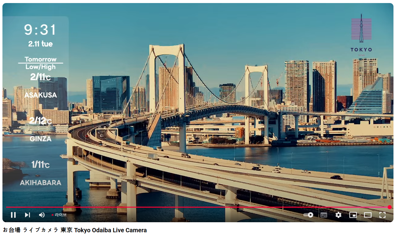 여행_사진_영상/여행_일상 [LIVE] お台場 ライブカメラ 東京 Tokyo Odaiba Live Camera 홍반장水_ 2025. 2. 11. 09:33 반응형 [LIVE] お台場 ライブカメラ 東京 Tokyo Odaiba Live Camera https://www.youtube.com/watch?v=AvPU0ljHO98 반응형 저작자표시 비영리 (새창열림)