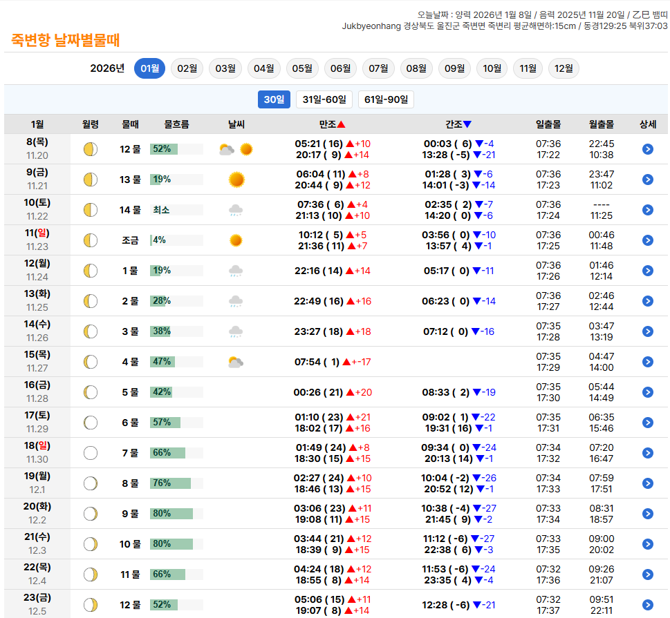 [물때] 2026-01-15, 경북 울진 죽변항 물때표