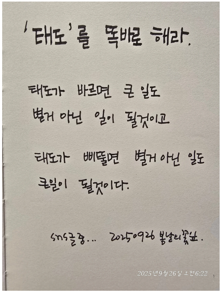 내 태도는 내 감정에서 시작된다. 마음이 불안하면 행동도 불안해지고, 마음이 차분하면 말투도 부드러워진다. 결국 태도는 감정이 얼굴을 바꿔 쓴 모습이다. 반대로 타인의 태도는 그 사람의 감정에서 비롯되기에 내가 바꿀 수는 없다. 그래서 중요한 건 남의 태도에 휘말리지 않고, 내 감정을 잘 다스려 내 태도를 바르게 세우는 일이다.